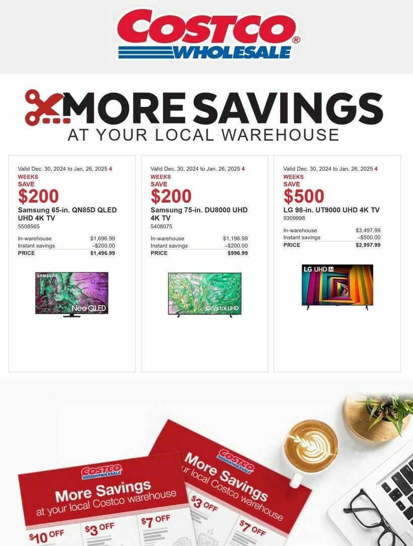 This page provides you with the latest weekly flyer for Costco. It is valid from Monday 12/30 through Sunday 01/26/2025. You can browse through 9 pages. You are on page number 1. Deals expire in . Future deals will be available here on Monday 01/27/2025. Special offers are available here for Costco during public holidays. These include: Family Day, Victoria Day and Canada Day. Please see Walmart Flyer from December 11 (valid from Thursday 12/11 through Wednesday 12/17/2025) for more interesting offers. Additional information can be found at www.costco.ca or by dialing 1-888-426-7826.