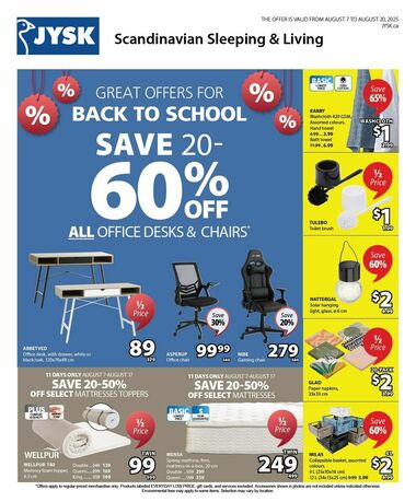 This page provides you with the latest weekly flyer for JYSK. Offers are valid Thursday 10/03 through Wednesday 10/09/2024. You can browse through 23 pages. You are on page number 1. left till the offers expire. Future deals will be available here on Thursday 10/10/2024. During public holidays (Easter Sunday, Family Day and Victoria Day, etc.), JYSK special offers are available here. Additional information can be found at www.jysk.ca or by dialing 1-888-696-5975.