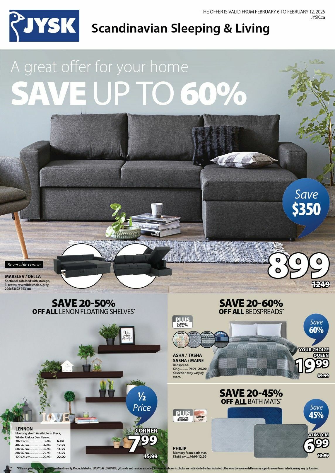 This page provides you with the latest weekly flyer for JYSK. Offers are valid Thursday 02/06 through Wednesday 02/12/2025. You can browse through 24 pages. You are on page number 1. left till the offers expire. Future deals will be available here on Thursday 02/13/2025. During public holidays (Thanksgiving, Remembrance Day and Black Friday, etc.), JYSK special offers are available here. Additional information can be found at www.jysk.ca or by dialing 1-888-696-5975.