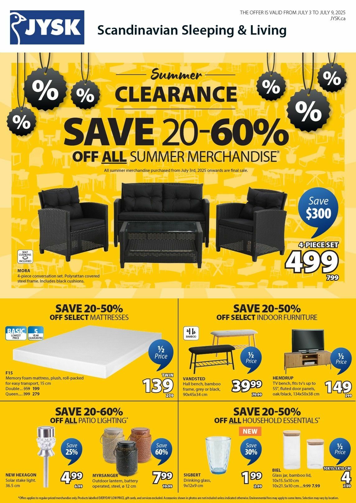 This page provides you with the latest weekly flyer for JYSK. Offers are valid Thursday 07/03 through Wednesday 07/09/2025. You can browse through 23 pages. You are on page number 1. left till the offers expire. Future deals will be available here on Thursday 07/10/2025. During public holidays (Canada Day, Civic Holiday and Labour Day, etc.), JYSK special offers are available here. Additional information can be found at www.jysk.ca or by dialing 1-888-696-5975.