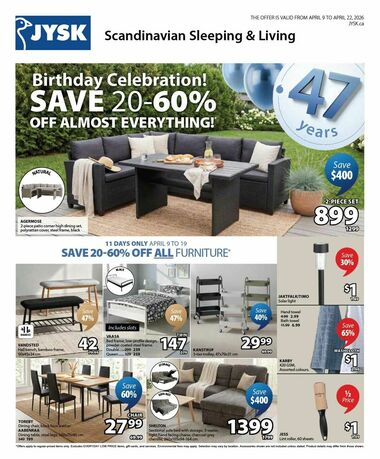 This page provides you with the latest weekly flyer for JYSK. Offers start Thursday 01/01 and expire Tuesday 06/30/2026. You can browse through 85 pages. You are on page number 50. You have 83 days left before deals expire. Future deals will be available here on Wednesday 07/01/2026. JYSK is preparing special offers to celebrate national holidays such as Easter Monday, Easter Sunday and Family Day. You will find the offers here. Additional information can be found at www.jysk.ca or by dialing 1-888-696-5975.