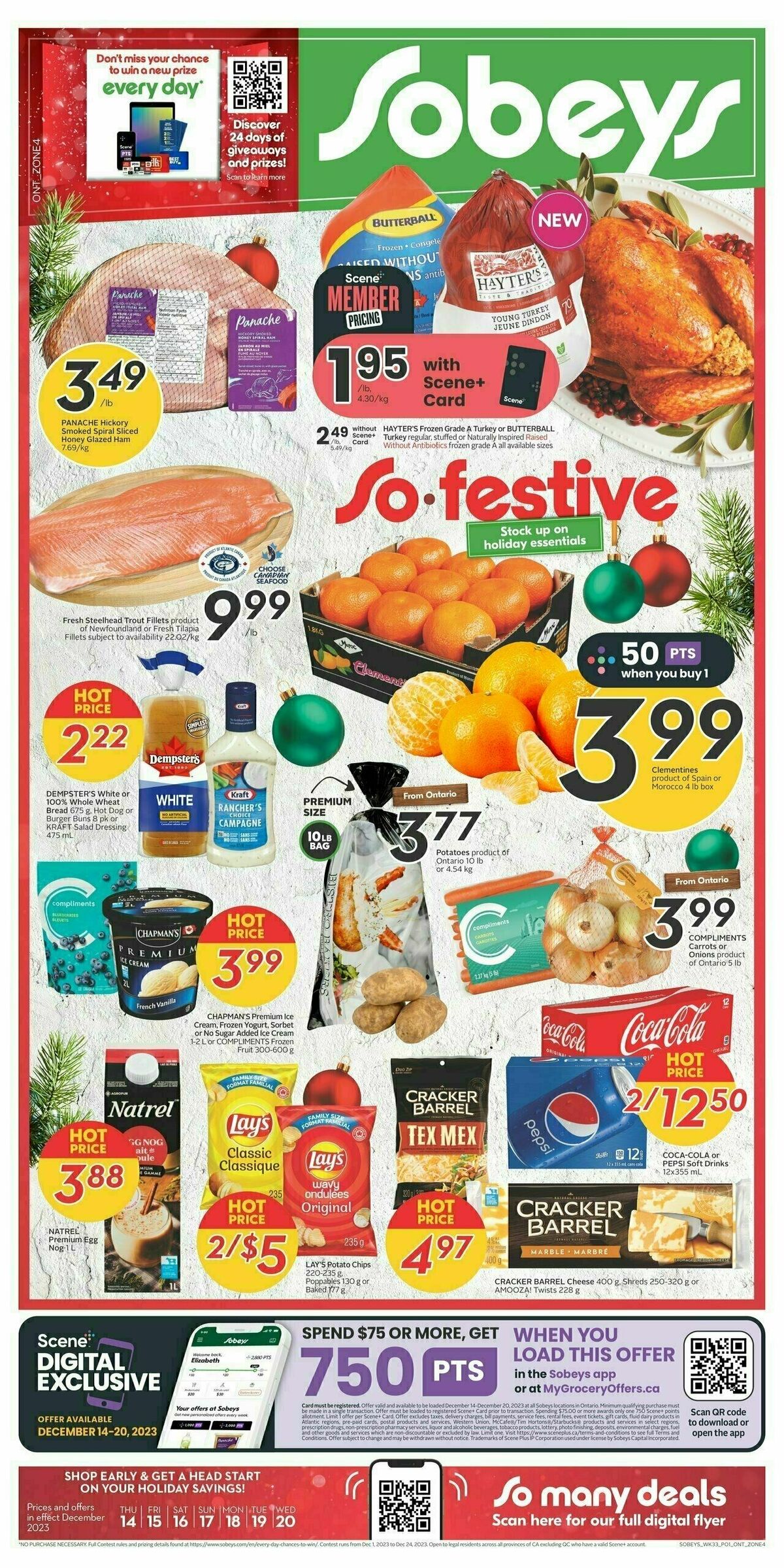 This page provides you with the latest weekly flyer for Sobeys. Offers are valid Thursday 12/14 through Wednesday 12/20/2023. You can browse through 18 pages. You are on page number 1. left till the offers expire. Future deals will be available here on Thursday 12/21/2023. During public holidays (Easter Sunday, Family Day and Victoria Day, etc.), Sobeys special offers are available here. Please see Walmart Flyer from December 18 (valid from Thursday 12/18 through Wednesday 12/24/2025) for more interesting offers. Additional information can be found at www.sobeys.com or by dialing 1-888-944-0442.