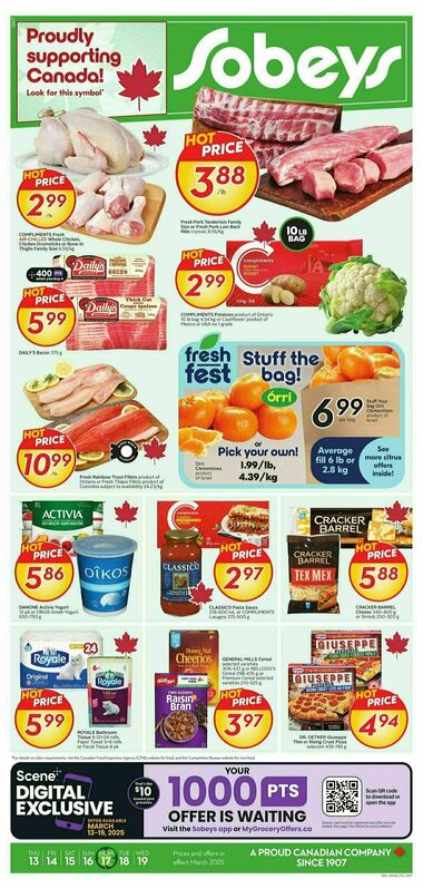 This page provides you with the latest weekly flyer for Sobeys. It is valid from Thursday 06/06 through Wednesday 06/12/2024. You can browse through 17 pages. You are on page number 1. Deals expire in . Future deals will be available here on Thursday 06/13/2024. Special offers are available here for Sobeys during public holidays. These include: Remembrance Day, Black Friday and Xmas Day. Please see Walmart Flyer from December 11 (valid from Thursday 12/11 through Wednesday 12/17/2025) for more interesting offers. Additional information can be found at www.sobeys.com or by dialing 1-888-944-0442.