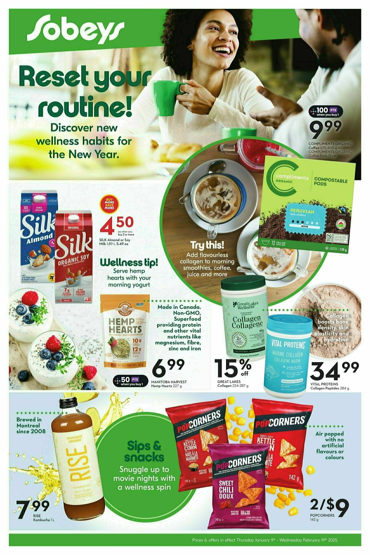 This page provides you with the latest weekly flyer for Sobeys. Offers start Thursday 01/09 and expire Wednesday 02/19/2025. You can browse through 7 pages. You are on page number 1. You have left before deals expire. Future deals will be available here on Thursday 02/20/2025. Sobeys is preparing special offers to celebrate national holidays such as Black Friday, Xmas Day and New Year's Day. You will find the offers here. Please see Walmart Flyer from December 11 (valid from Thursday 12/11 through Wednesday 12/17/2025) for more interesting offers. Additional information can be found at www.sobeys.com or by dialing 1-888-944-0442.