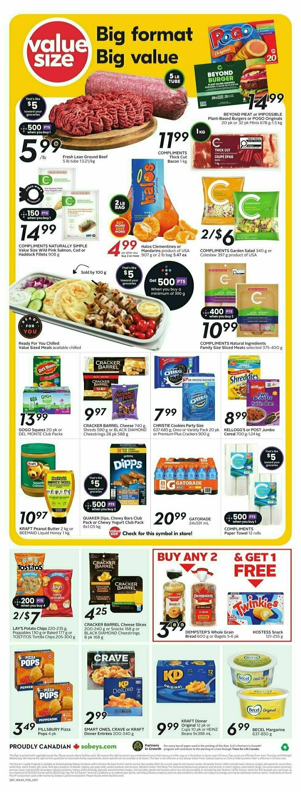 This page provides you with the latest weekly flyer for Sobeys. Offers start Thursday 01/30 and expire Wednesday 02/05/2025. You can browse through 17 pages. You are on page number 2. You have left before deals expire. Future deals will be available here on Thursday 02/06/2025. Sobeys is preparing special offers to celebrate national holidays such as New Year's Day, Boxing Day and Good Friday. You will find the offers here. Please see Walmart Flyer from December 18 (valid from Thursday 12/18 through Wednesday 12/24/2025) for more interesting offers. Additional information can be found at www.sobeys.com or by dialing 1-888-944-0442.