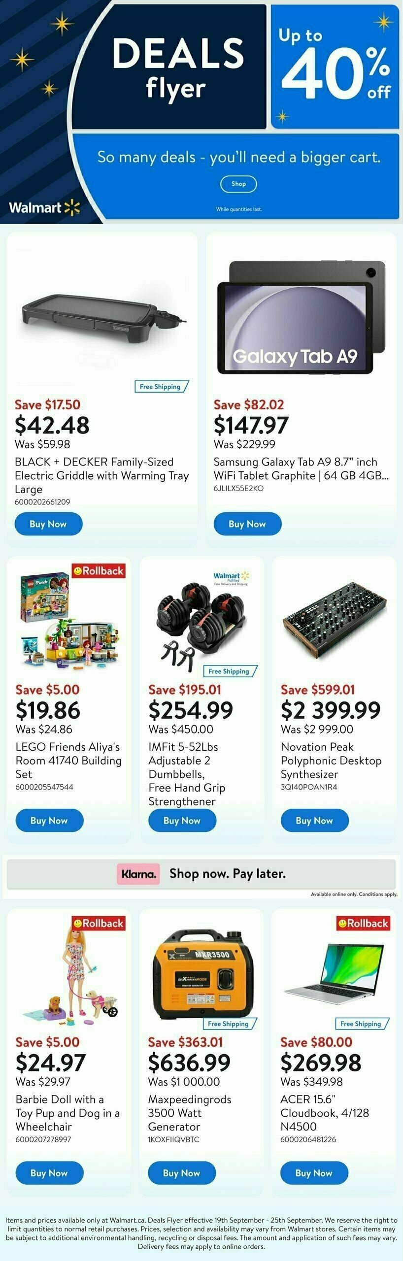 On this page you can find the latest weekly flyer for Walmart. It is valid from Thursday 09/19 through Wednesday 09/25/2024. You are currently viewing page 1 out of 13. Deals expire in . A brand new weekly flyer will be available here on Thursday 09/26/2024. Special offers are available here for Walmart during public holidays. These include: Civic Holiday, Labour Day and Thanksgiving. Other interesting flyers are available on this page. These include Safeway Flyer from December 11 (valid from Thursday 12/11 through Wednesday 12/17/2025). Dial the number 1-800-328-0402 or go to www.walmart.ca for additional information.
