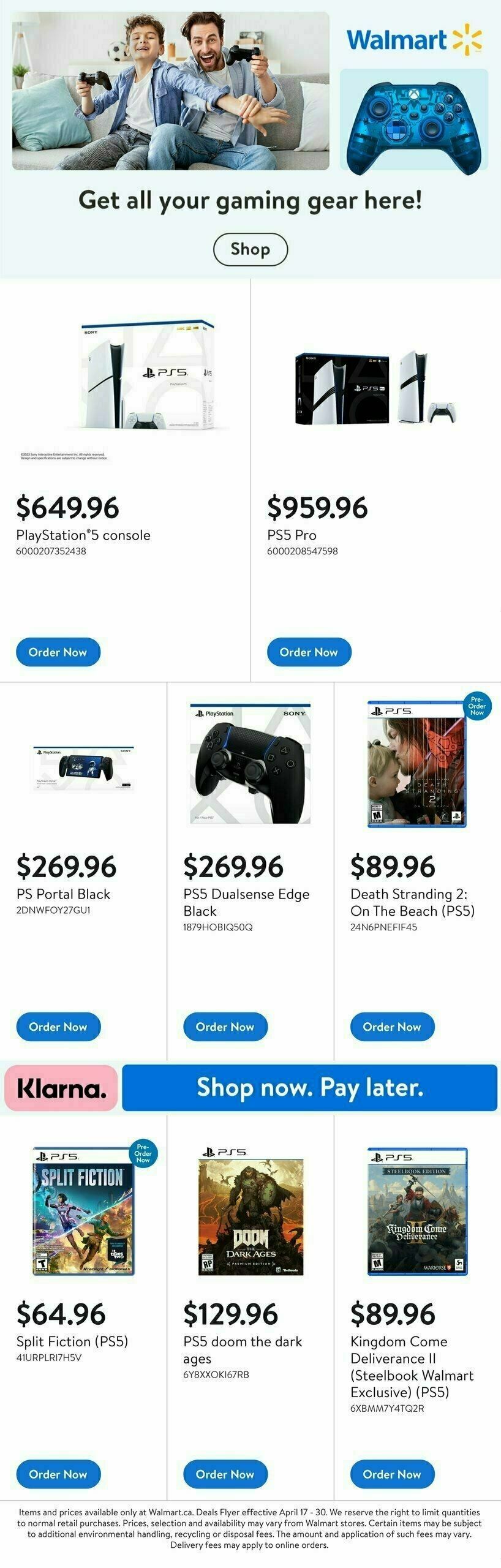 On this page you can find the latest weekly flyer for Walmart. It is valid from Thursday 04/17 through Wednesday 04/30/2025. You are currently viewing page 1 out of 7. Deals expire in . A brand new weekly flyer will be available here on Thursday 05/01/2025. Special offers are available here for Walmart during public holidays. These include: Good Friday, Easter Monday and Easter Sunday. Other interesting flyers are available on this page. These include Safeway Flyer from December 11 (valid from Thursday 12/11 through Wednesday 12/17/2025). Dial the number 1-800-328-0402 or go to www.walmart.ca for additional information.