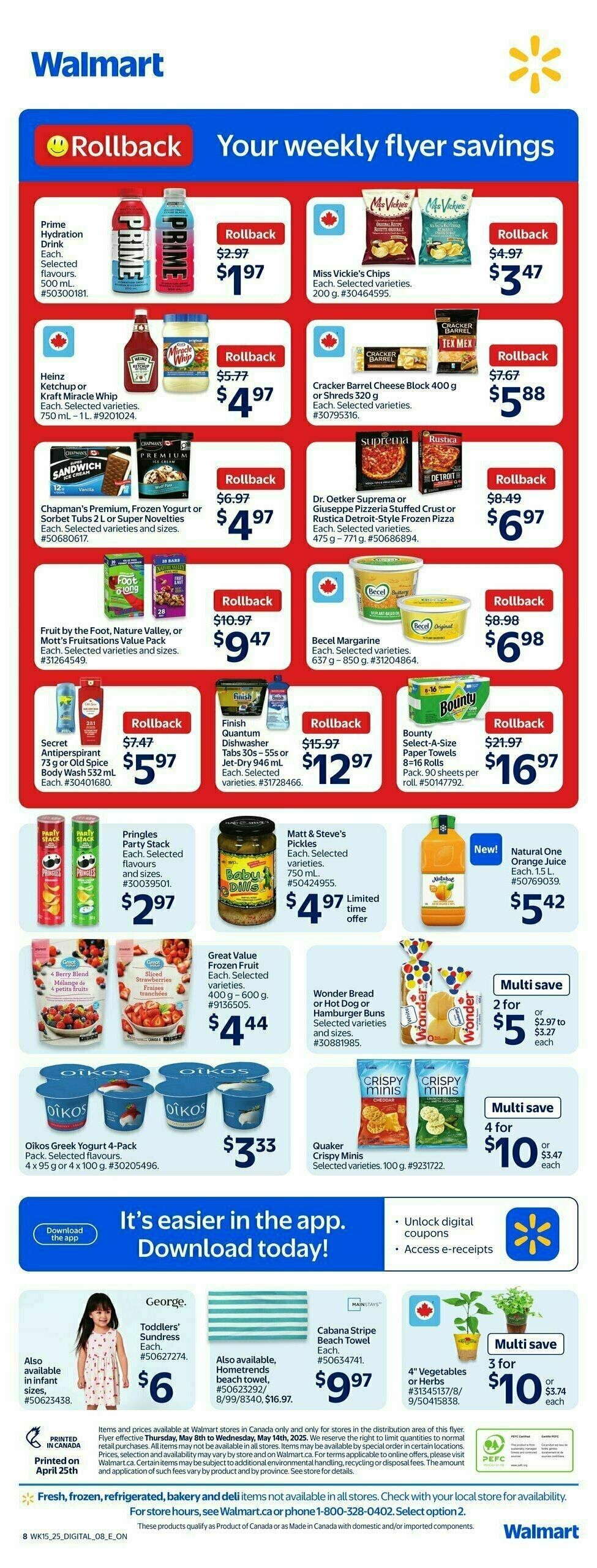On this page you can find the latest weekly flyer for Walmart. Offers start Thursday 05/08 and expire Wednesday 05/14/2025. You are currently viewing page 2 out of 27. You have left before deals expire. A brand new weekly flyer will be available here on Thursday 05/15/2025. Walmart is preparing special offers to celebrate national holidays such as Victoria Day, Canada Day and Civic Holiday. You will find the offers here. Other interesting flyers are available on this page. These include Safeway Flyer from December 11 (valid from Thursday 12/11 through Wednesday 12/17/2025). Dial the number 1-800-328-0402 or go to www.walmart.ca for additional information.