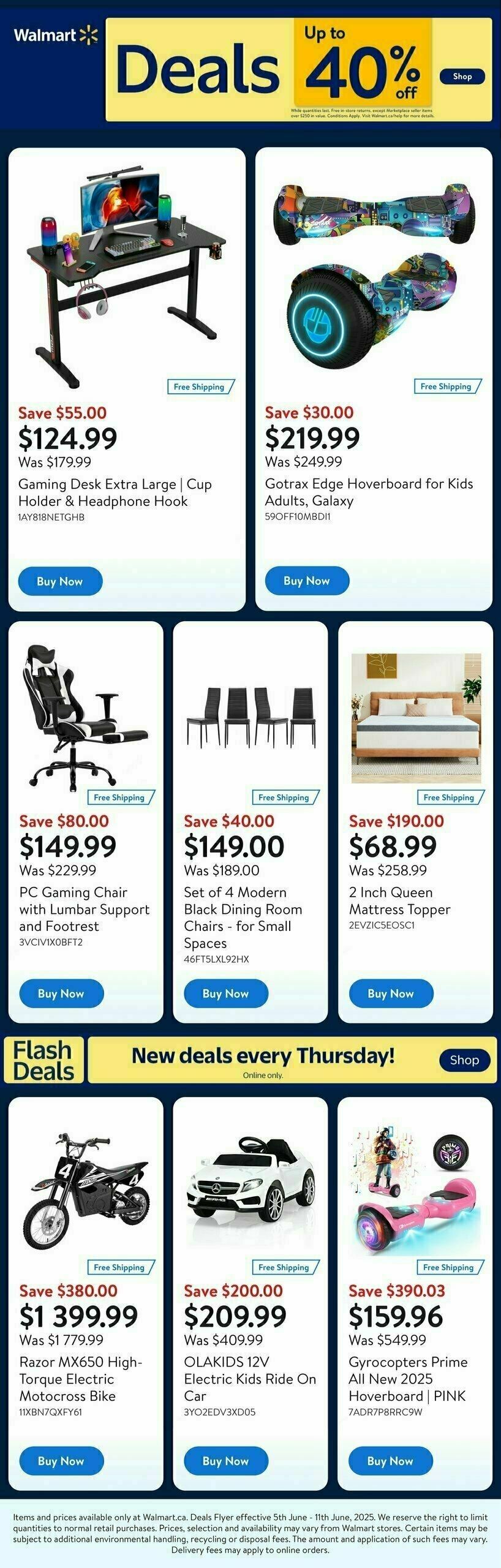 On this page you can find the latest weekly flyer for Walmart. Offers are valid Thursday 06/05 through Wednesday 06/11/2025. You are currently viewing page 1 out of 10. left till the offers expire. A brand new weekly flyer will be available here on Thursday 06/12/2025. During public holidays (Boxing Day, Good Friday and Easter Monday, etc.), Walmart special offers are available here. Other interesting flyers are available on this page. These include Safeway Flyer from December 11 (valid from Thursday 12/11 through Wednesday 12/17/2025). Dial the number 1-800-328-0402 or go to www.walmart.ca for additional information.