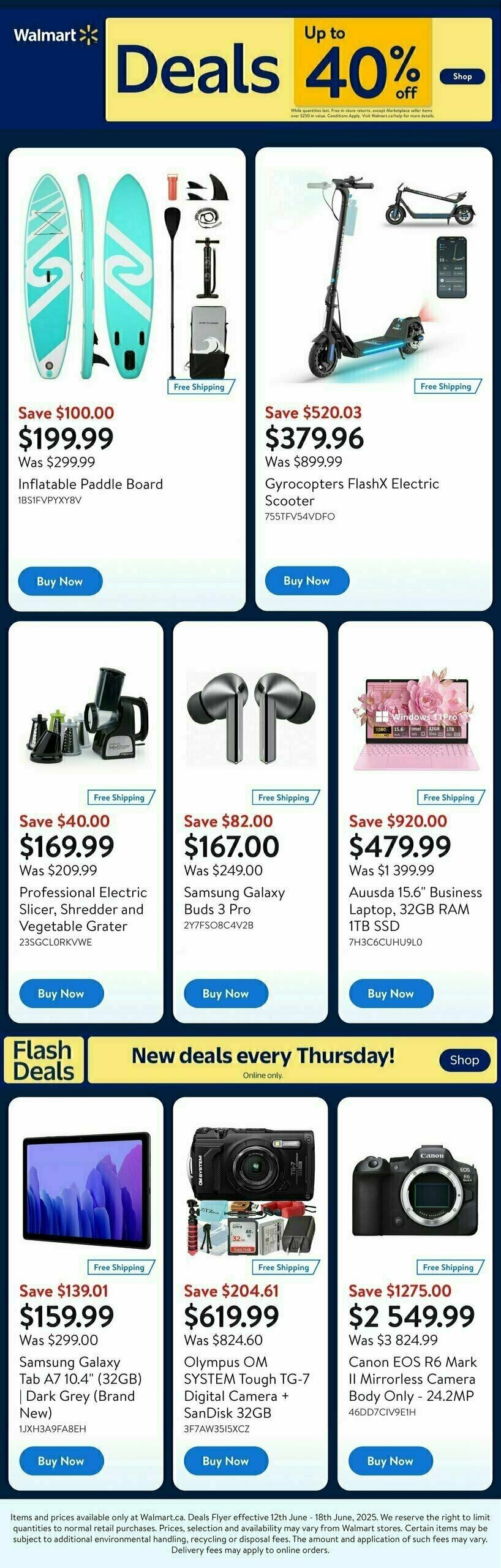 On this page you can find the latest weekly flyer for Walmart. It is valid from Thursday 06/12 through Wednesday 06/18/2025. You are currently viewing page 1 out of 12. Deals expire in . A brand new weekly flyer will be available here on Thursday 06/19/2025. Special offers are available here for Walmart during public holidays. These include: Civic Holiday, Labour Day and Thanksgiving. Other interesting flyers are available on this page. These include Safeway Flyer from December 11 (valid from Thursday 12/11 through Wednesday 12/17/2025). Dial the number 1-800-328-0402 or go to www.walmart.ca for additional information.