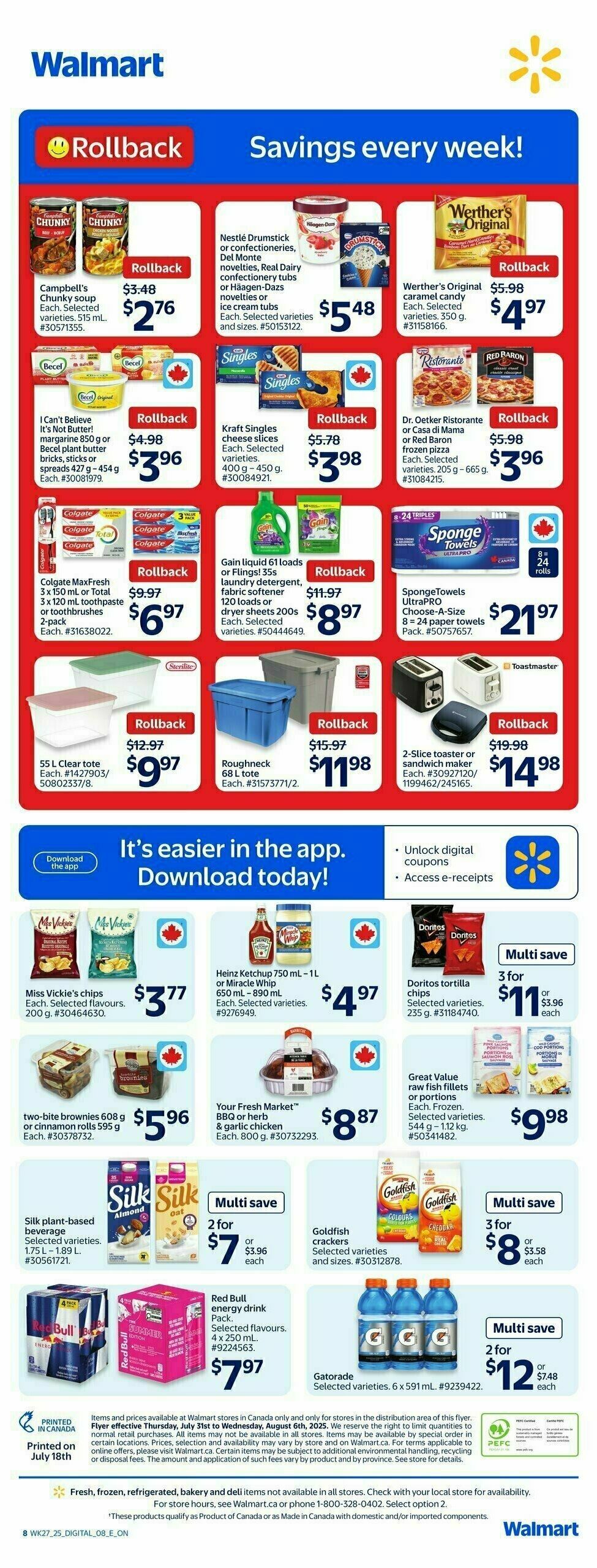 On this page you can find the latest weekly flyer for Walmart. Offers start Thursday 07/31 and expire Wednesday 08/06/2025. You are currently viewing page 2 out of 16. You have left before deals expire. A brand new weekly flyer will be available here on Thursday 08/07/2025. Walmart is preparing special offers to celebrate national holidays such as Black Friday, Xmas Day and New Year's Day. You will find the offers here. Other interesting flyers are available on this page. These include Safeway Flyer from December 18 (valid from Thursday 12/18 through Wednesday 12/24/2025). Dial the number 1-800-328-0402 or go to www.walmart.ca for additional information.