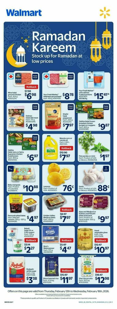 On this page you can find the latest weekly flyer for Walmart. It is valid from Thursday 02/12 through Wednesday 03/04/2026. You are currently viewing page 1 out of 2. Deals expire in 20 days. A brand new weekly flyer will be available here on Thursday 03/05/2026. Special offers are available here for Walmart during public holidays. These include: Civic Holiday, Labour Day and Thanksgiving. Please see Sobeys Happy Month of Ramadan Flyer from February 12 (valid from Thursday 02/12 through Wednesday 03/18/2026) for more interesting offers. Dial the number 1-800-328-0402 or go to www.walmart.ca for additional information.